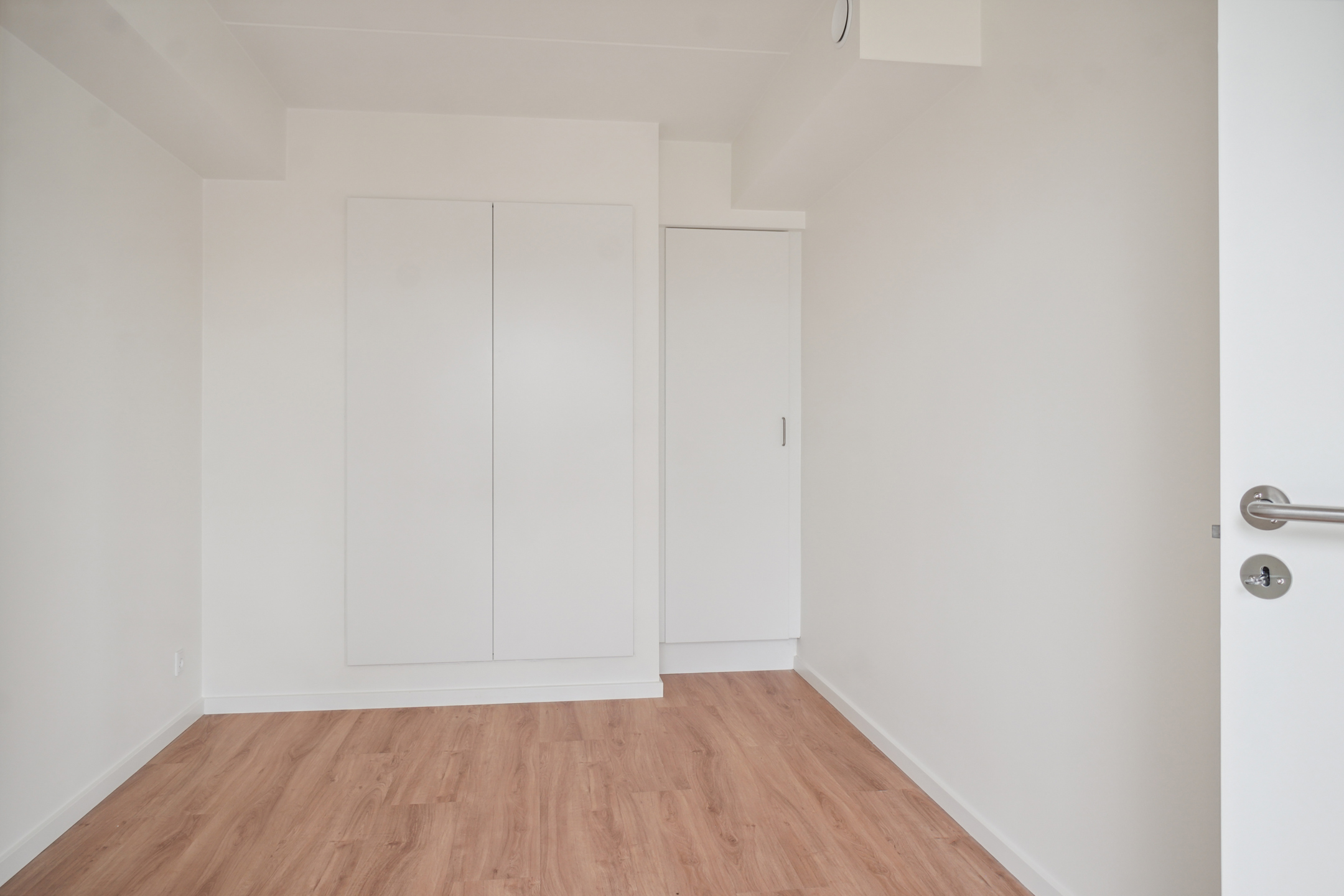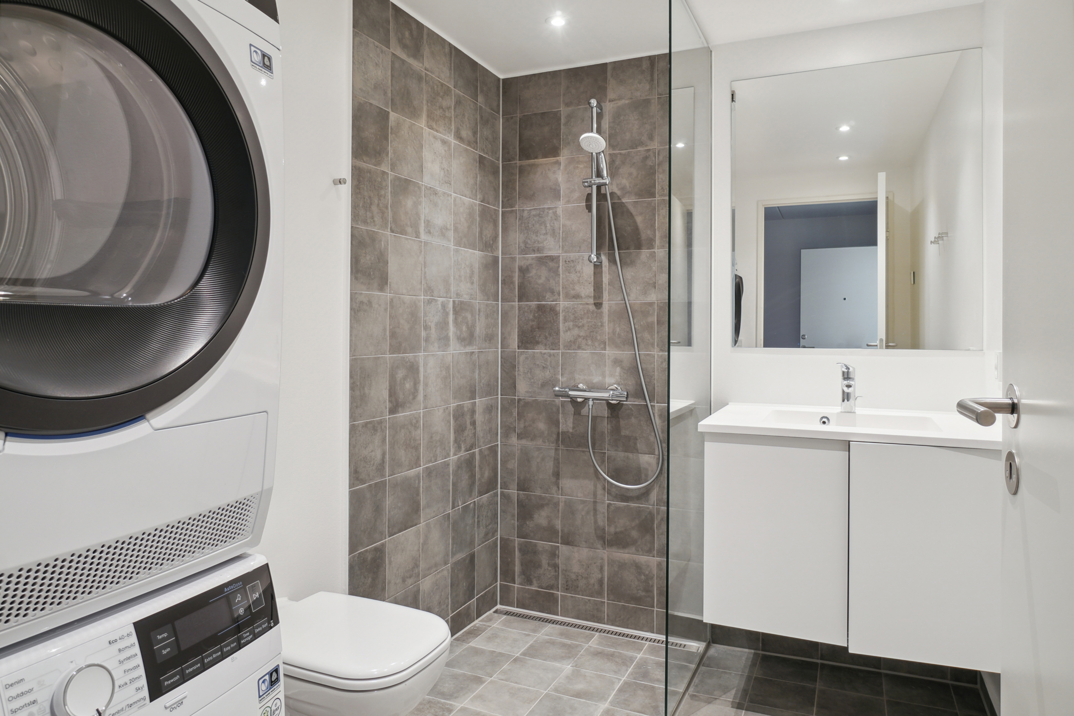 Soveværelset har en rigtig fin størrelse, hvor du har plads til en dobbeltseng. Der er et lækkert badeværelse, hvor vi har gjort klar til, at der kan installeres vaskemaskine og tørretumbler.