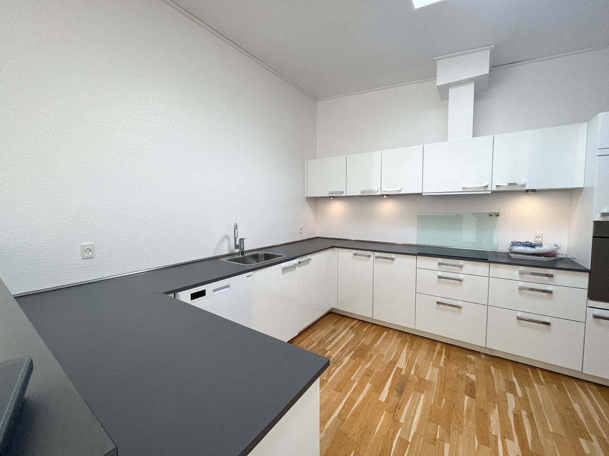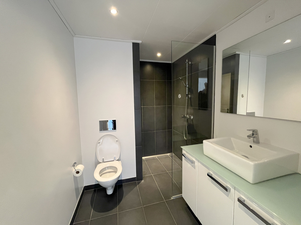 Det er et hvidt og åbent Alno køkken i forbindelse med stue og med køle/fryseskab, indbyg. ovn, emhætte, opvaskemaskine, keramisk kogeplade. Stort lækkert badeværelse med stor bruseniche. Der et stort soveværelse og et børneværelse/kontor - begge værelser er med skabe.